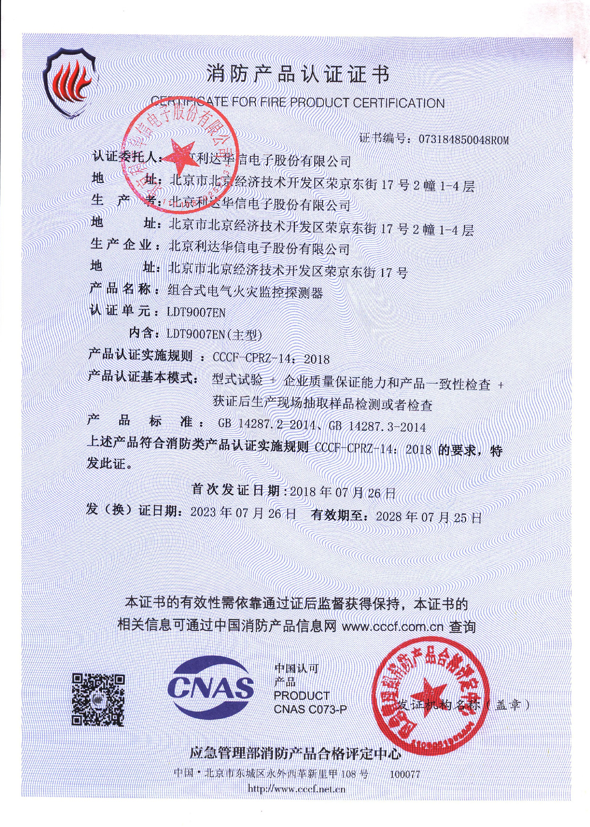 利达LDT9007EN组合式电气火灾监控探测器消防产品认证证书下载