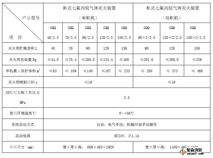 ▼柜式七氟丙烷气体灭火装置产品主要型号和主要参数: