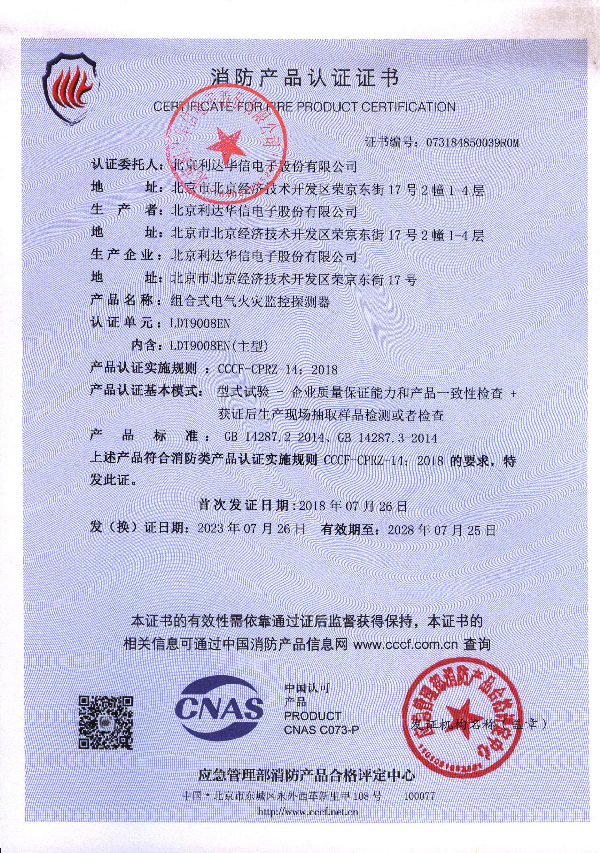 利达LDT9008EN组合式电气火灾监控探测器消防产品认证证书检测报告下载
