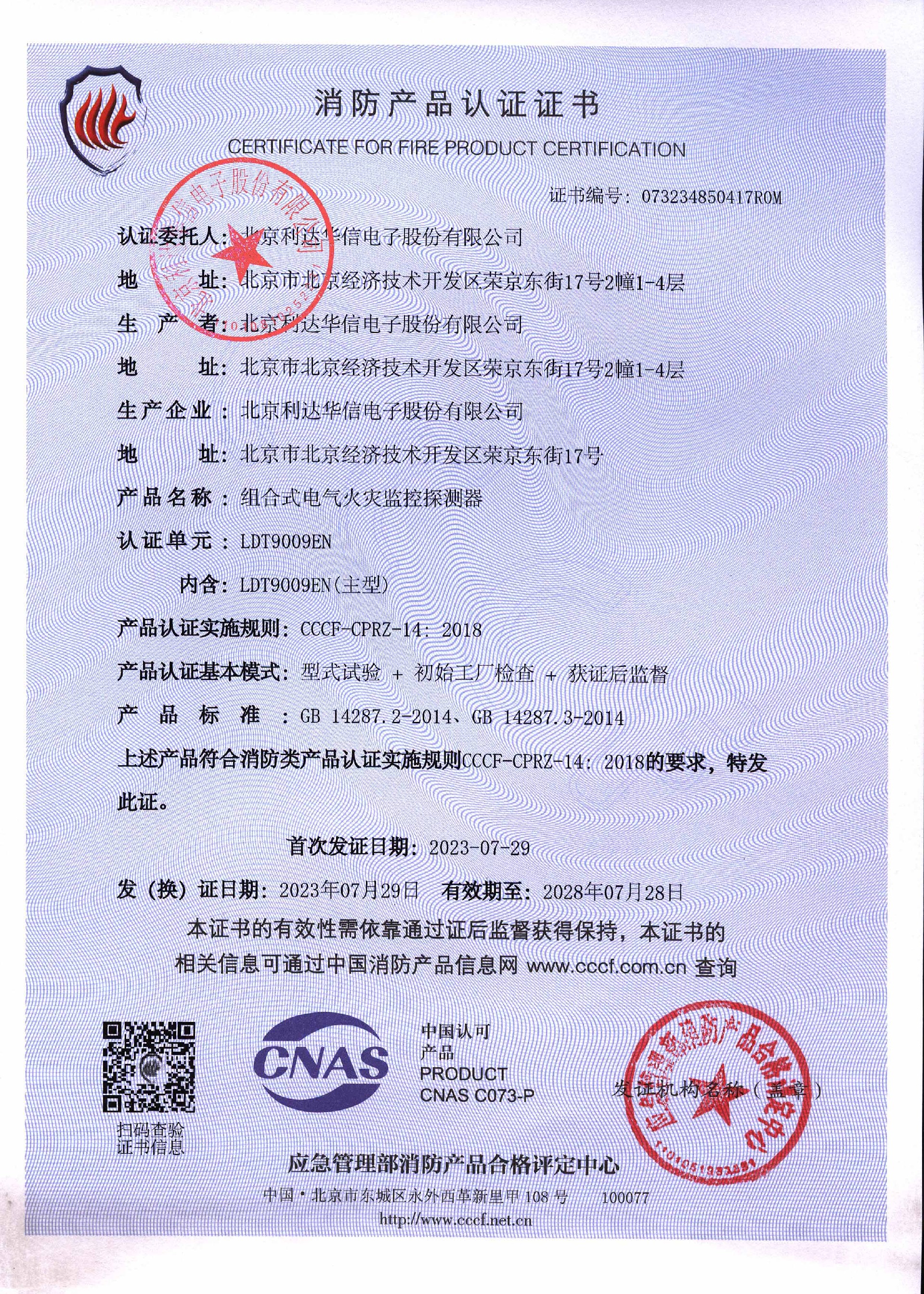利达LDT9009EN组合式电气火灾监控探测器检测报告下载
